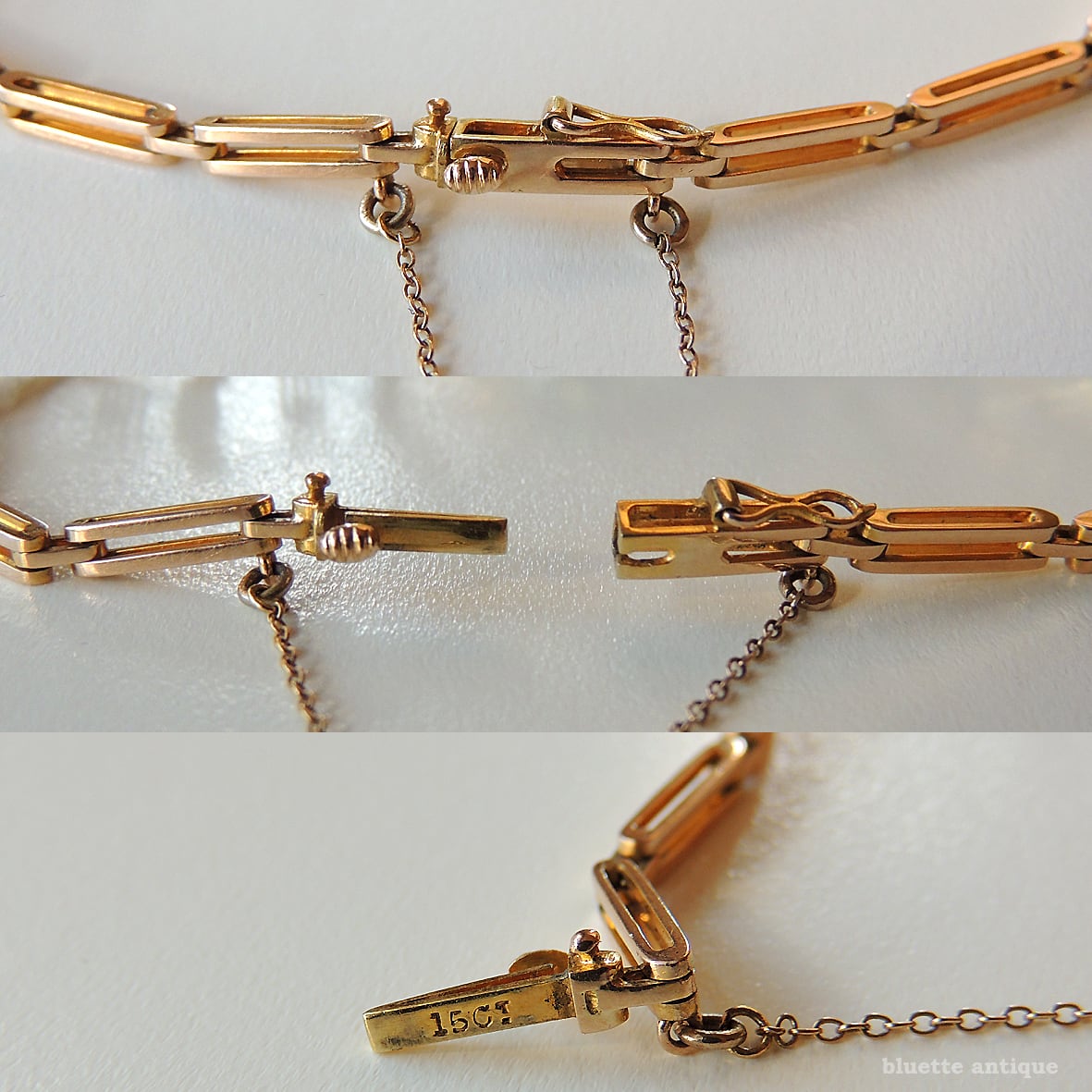 こちらのブレスレットには、ボックスクラスプ(Box Clasp)と呼ばれる差し込み式の留め具が用いられています。細長い箱状の受け部分に舌状の金具(タング)を差し込み、内部で固定する構造で、20世紀前半のアンティークジュエリーに多く見られる仕様です。外観のラインを崩さず、装着時もすっきりと美しく収まるのが特徴です。また、本品にはセーフティチェーンも備えられており、不意の開閉を防ぐ安心感があります。実用性と時代性をあわせ持つ、クラシカルなディテールです。