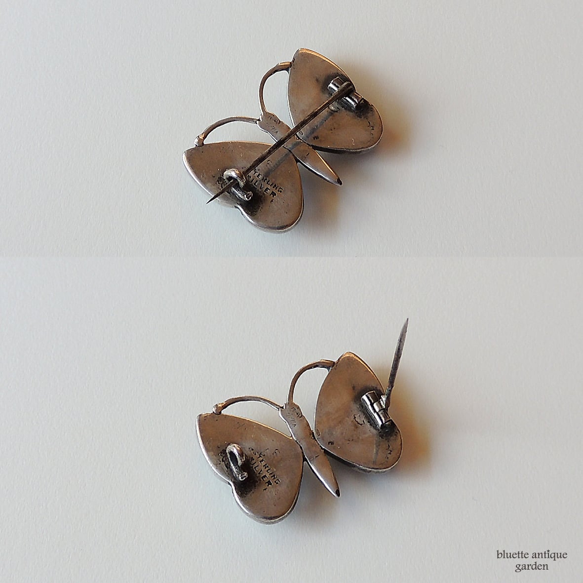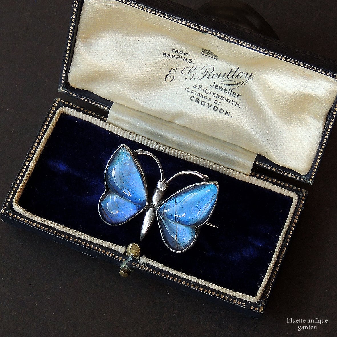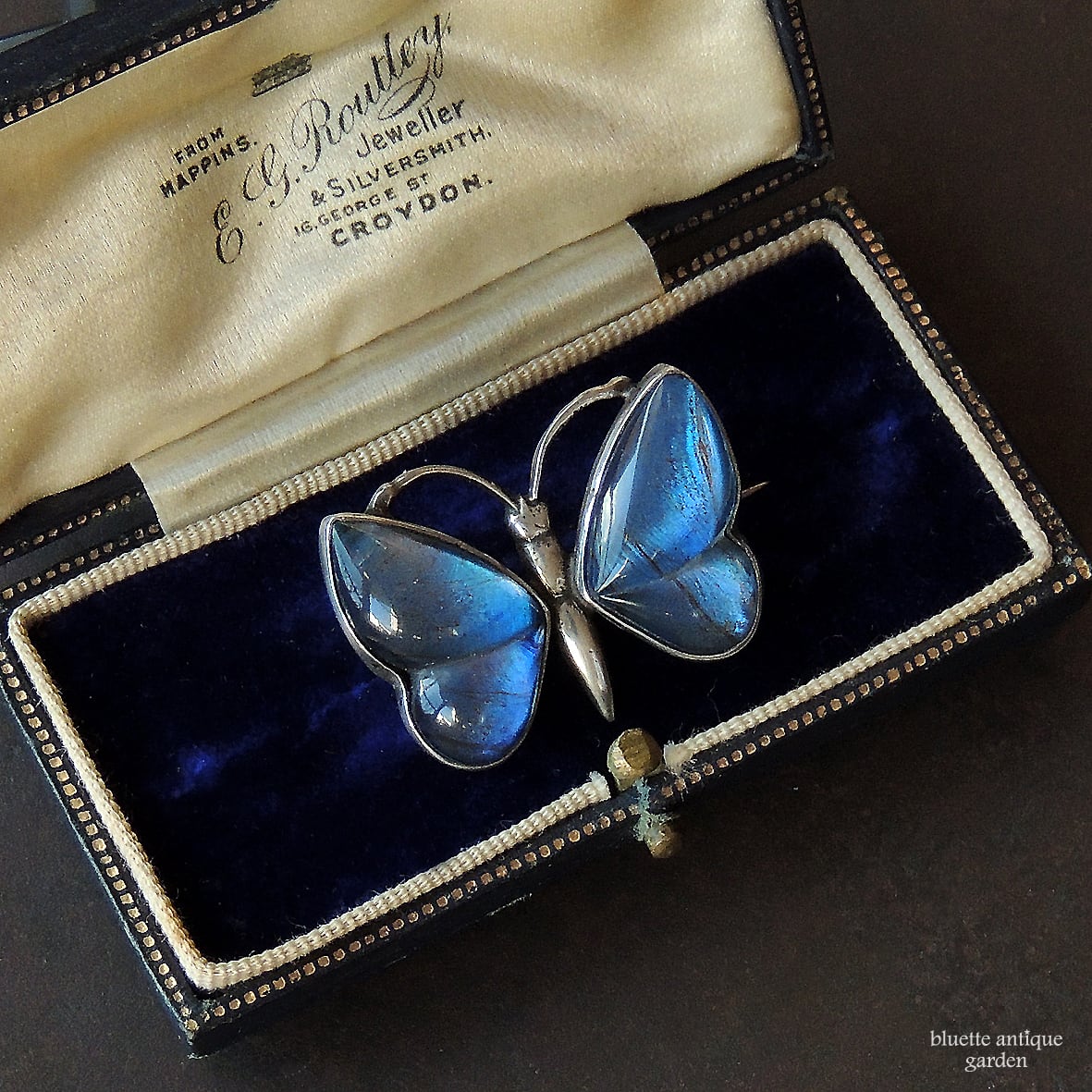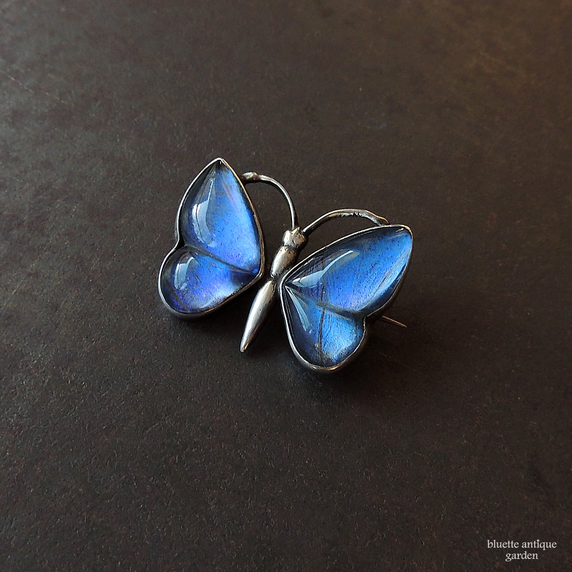 イギリスより、アンティーク、スターリングシルバー、モルフォ蝶のバタフライブローチです。