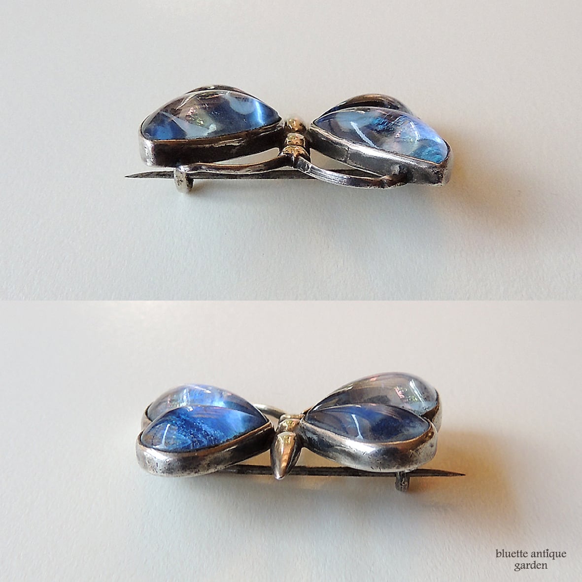ルーペで確認すると、ガラスの表面に傷・擦れ等有。裏のシルバー部分に傷、擦れ、黒ずみ等有。全体的にはアンティークの風合いが美しいブローチだと思います。