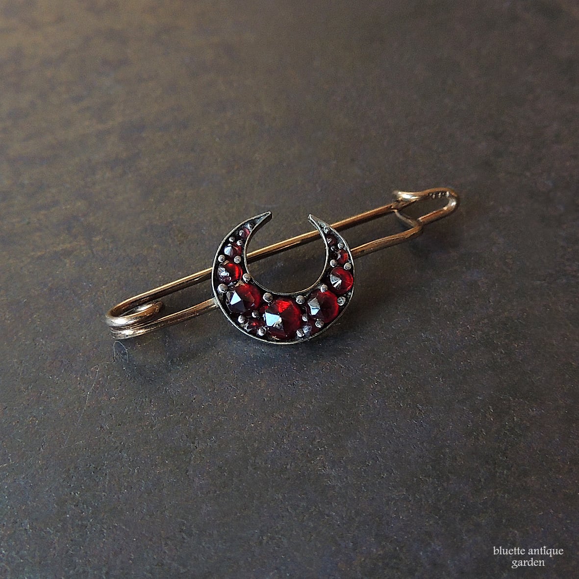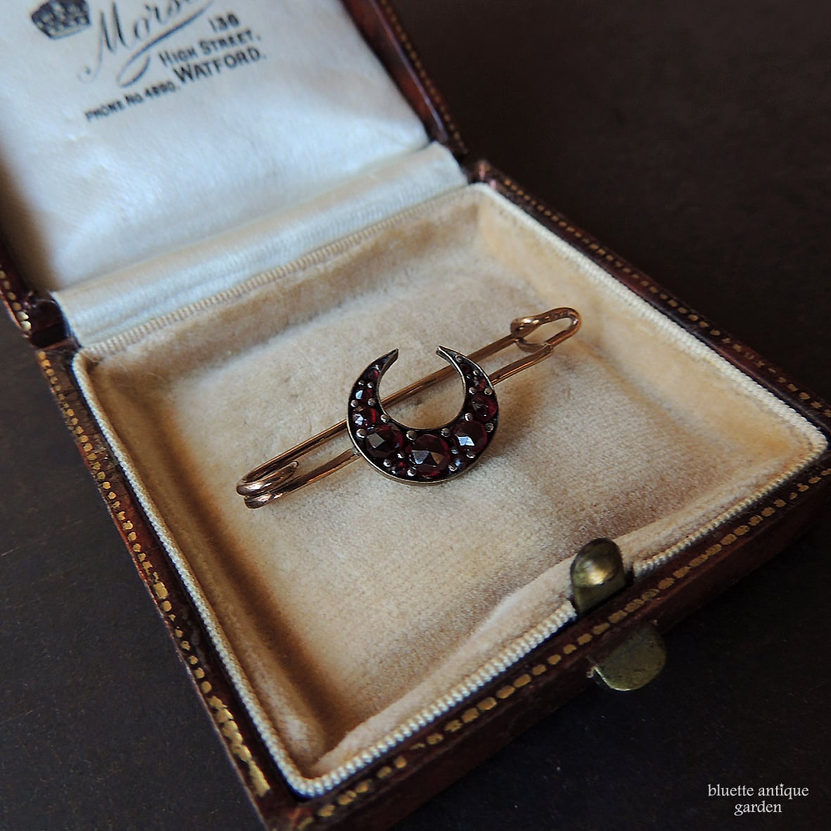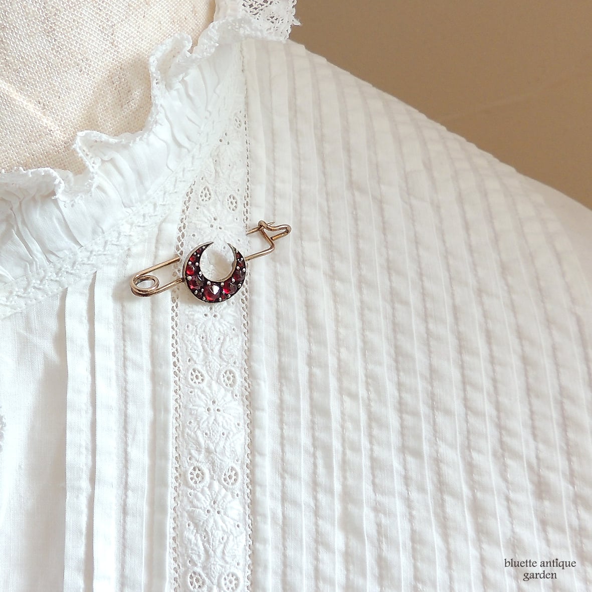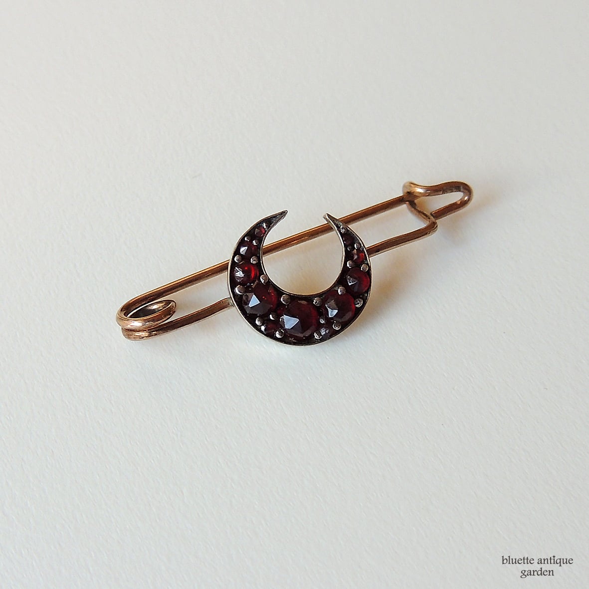 アンティークジュエリー 天然パイロープガーネット タイニークレセント(三日月) ピンブローチ(ソーティングメモ付)