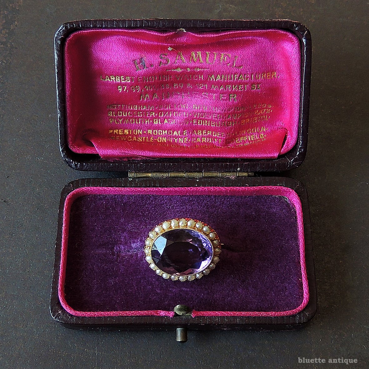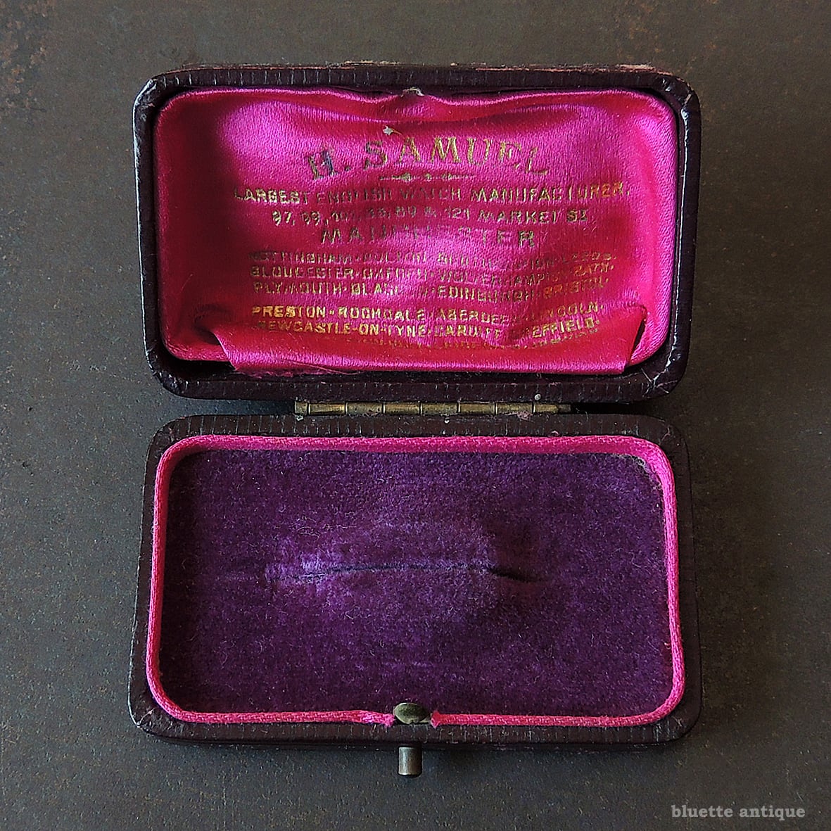 イギリスの老舗宝飾・時計商「H. SAMUEL」によるアンティークジュエリーケースです。蓋裏には読みにくい所も有りますが「H. SAMUEL LARGEST ENGLISH WATCH MANUFACTURER 97, 99, 101, 33, 89 & 121 MARKET ST. MANCHESTER」と金箔押しが施されており、当時の販売店用ケースであったことが確認できます。