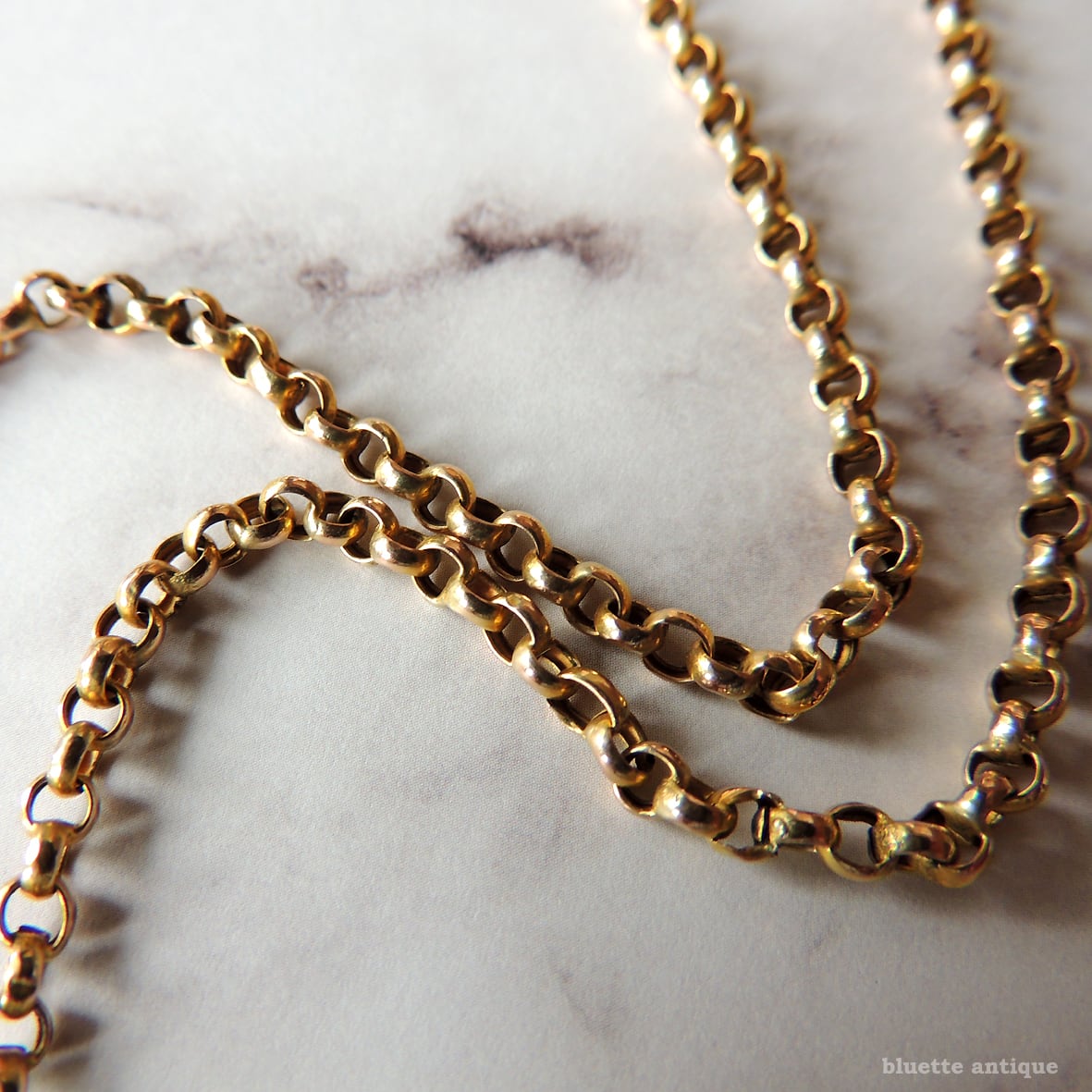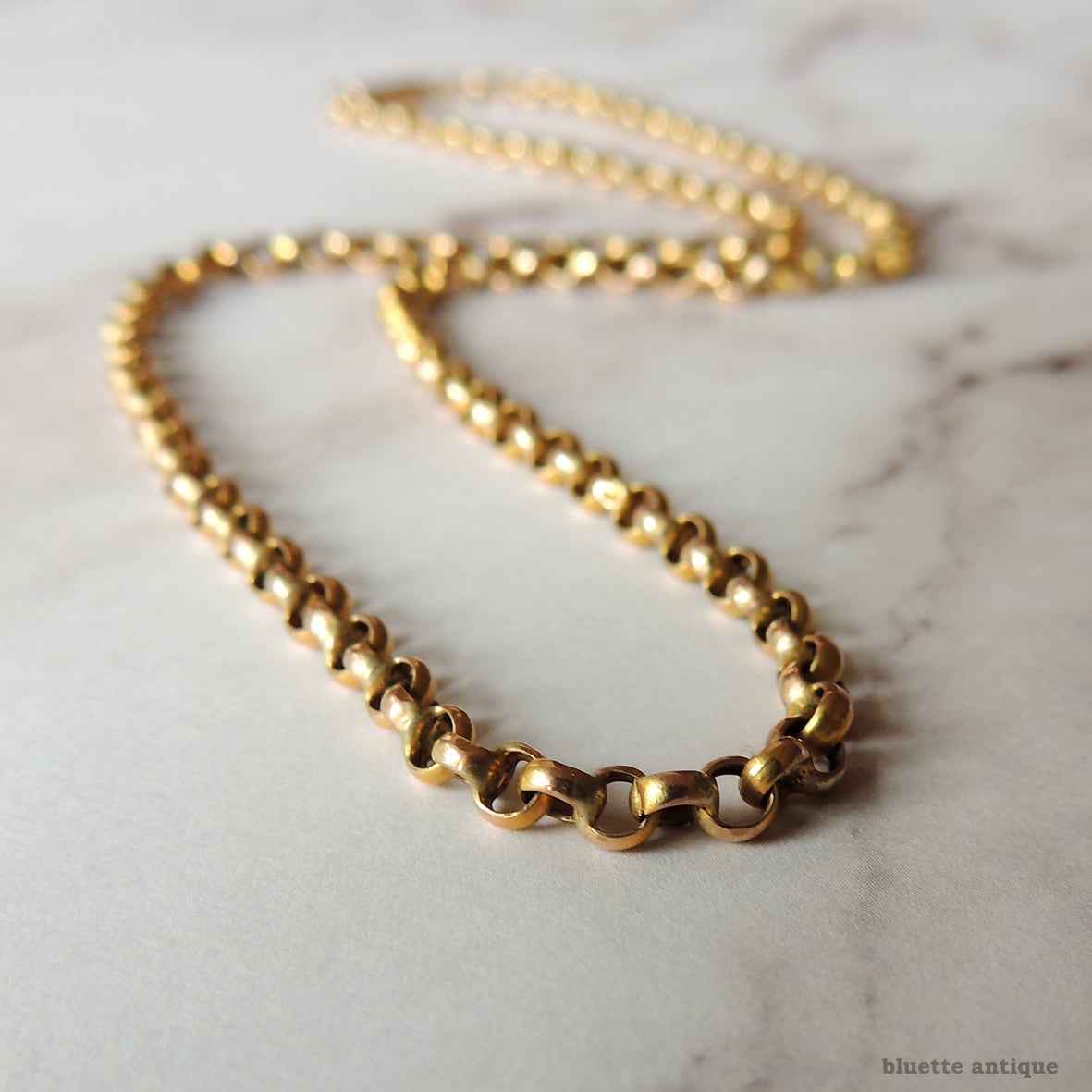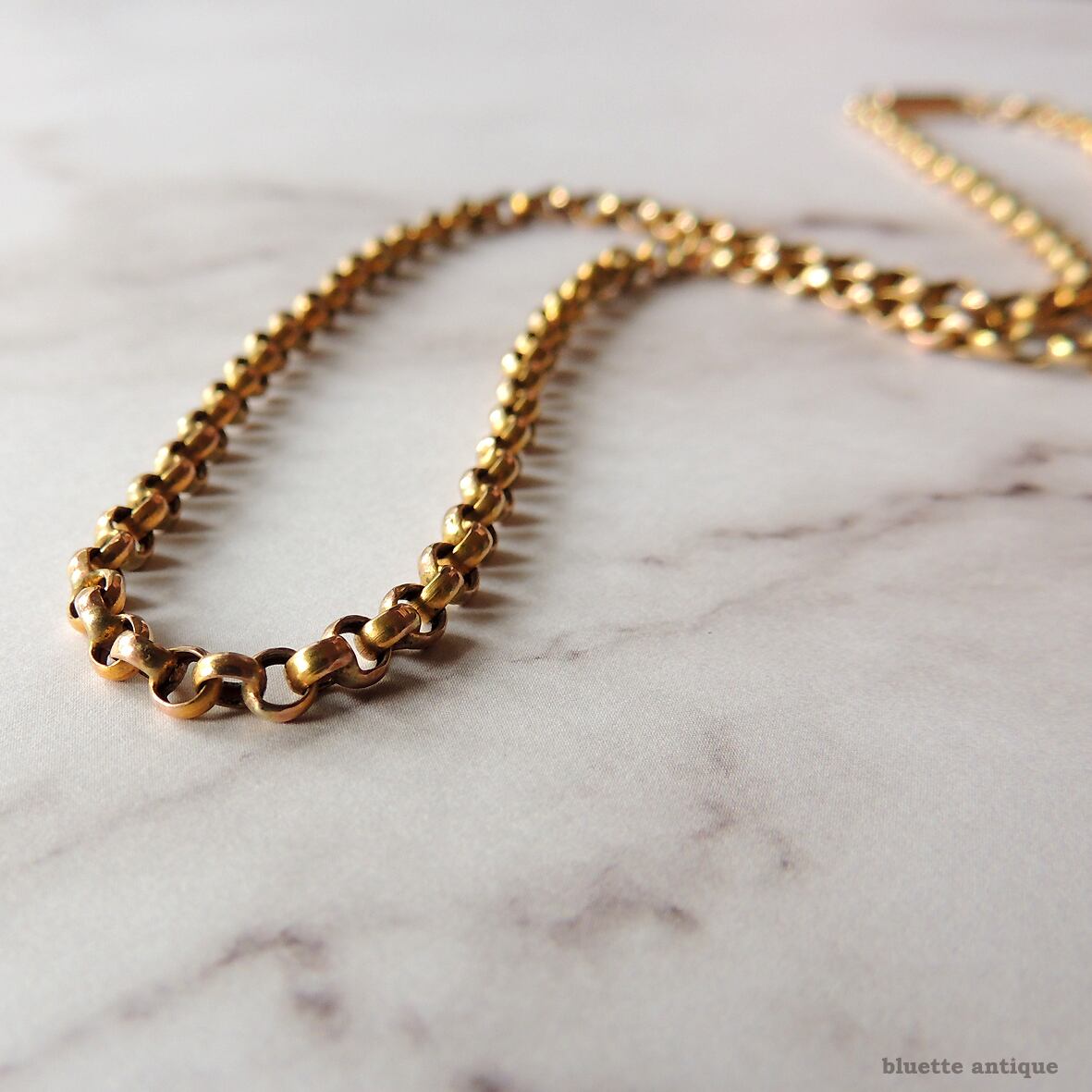 ルーペで一つひとつのリンクを細かく見ていくと、所々2つのリンクが接合されているもの、経年による黒ずみ・くすみ、表面のへこみ・歪み等有るものなど有りますが、着用に問題はなく、肉眼で見て特に気になるというものでは有りません。全体的にはコンディション良好の、美しいアンティークチェーンです。