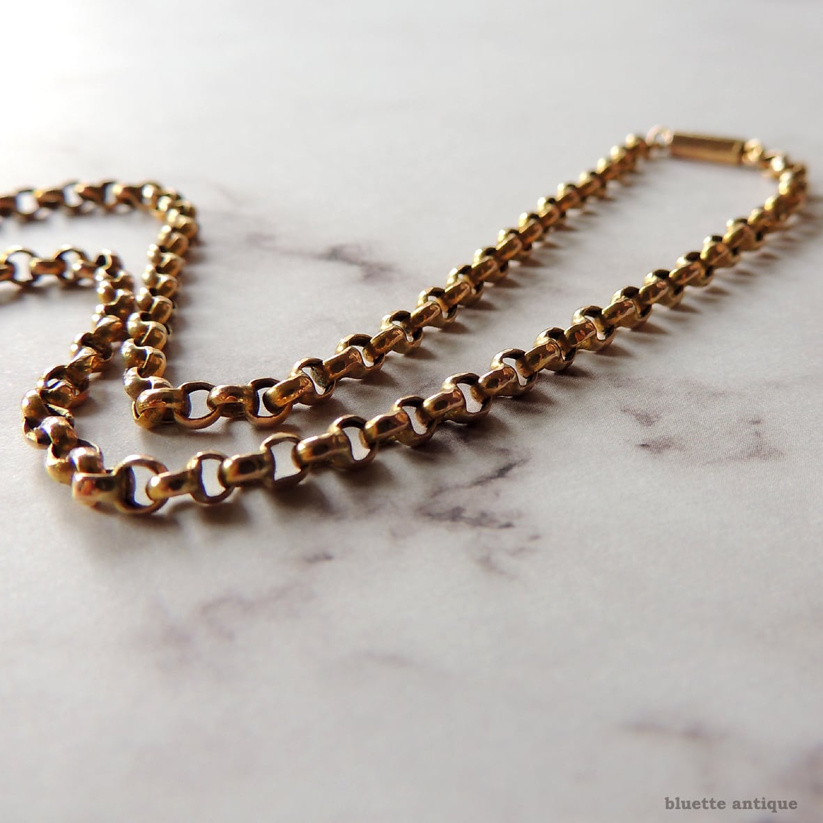 イギリスより、アンティーク、9金のベルチャーチェーンです。留め具はバレルクラスプ。クラスプ部分にやや消えかかっていますが、「9CT」の刻印有。