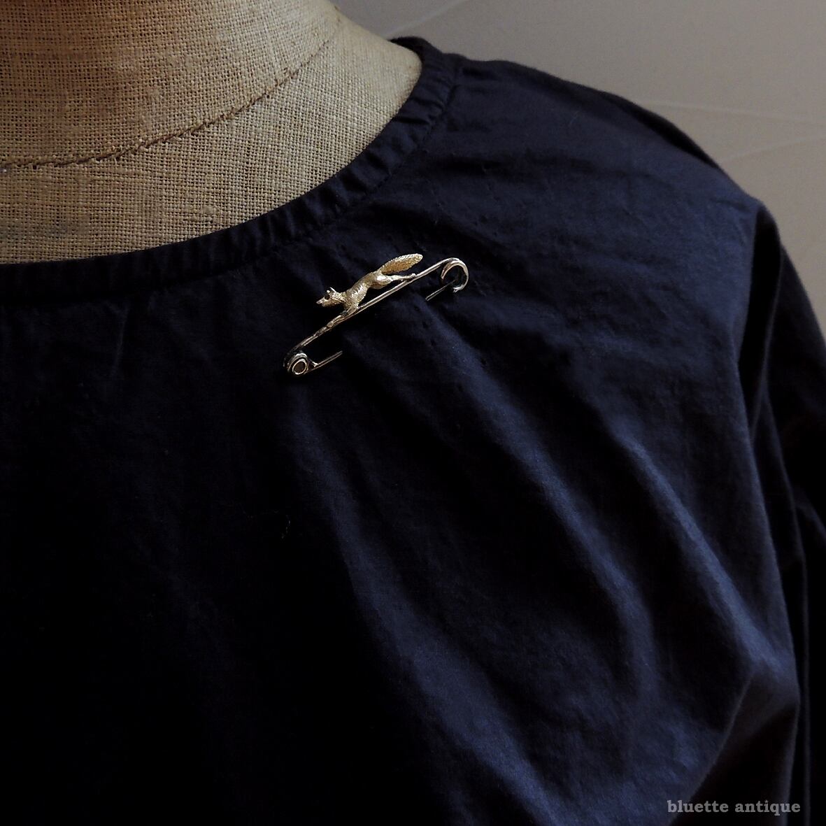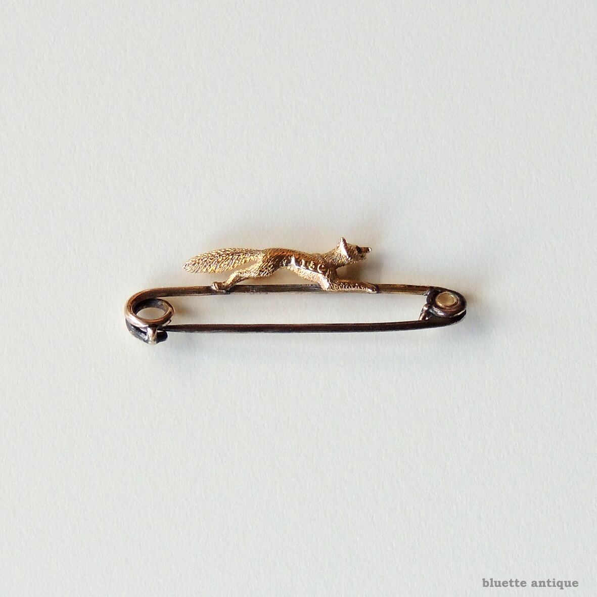 繊細で極小さなランニングフォックスのブローチ。15金のランニングフォックスは、なかなか出合えない、希少なものです。針に黒ずみがあるので、ホワイト系より、ダーク系のスタイルのワンポイントにお勧めです。