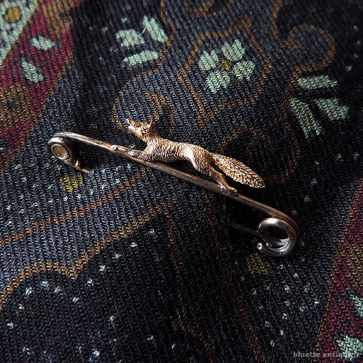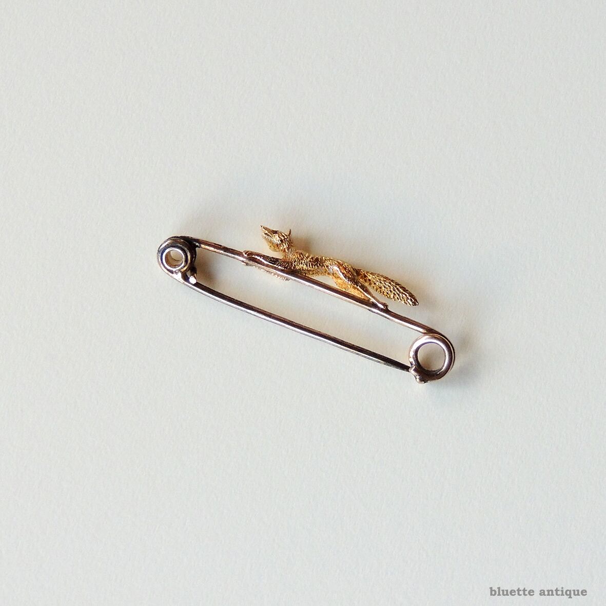 ピンに経年による黒ずみ・擦れ等有。針は全開しないタイプで緩みが有りますが、Cクラスプにおさまります。キツネは針にやや斜めにセットされており、着けると衣服を大地にしてまさに走っているようです。