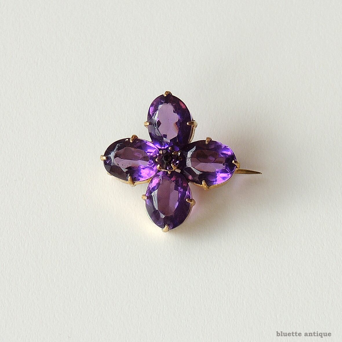 アンティークジュエリー 天然アメシスト 四つ葉のクローバー ブローチ (ソーティングメモ付)