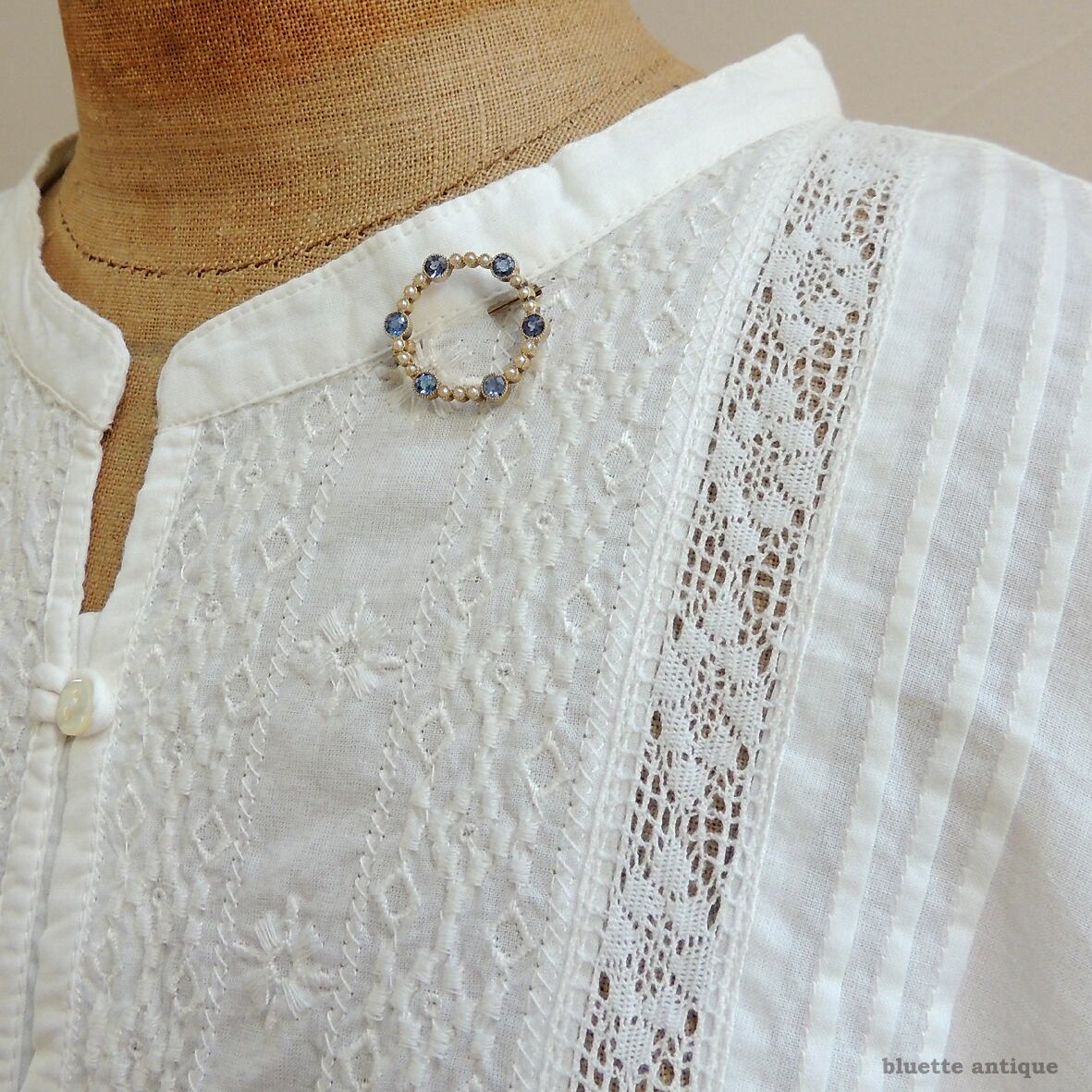 イギリスより、アンティーク、15金、天然サファイアとシードパールのサークルブローチです。直径約2.4cmの小さな円。背面にゴールドの品位を表す「15」の刻印有り。セーフティーチェーン用の小さなループが有ります。