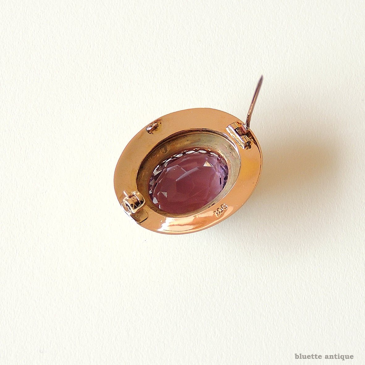 こちらはヴィクトリアン定番のレースピンに、枠の装飾を後の時代にプラスしたデザイン。アメシストは存在感ある大粒で、クラシカルな爪に掲げられており、赤みを帯びた澄んだ紫、その周りをアンティークジュエリーによく見られる、ハーフカットのシードパールが取り巻いています。台は9金、背面にそれぞれ「9CT」の刻印が有ります。