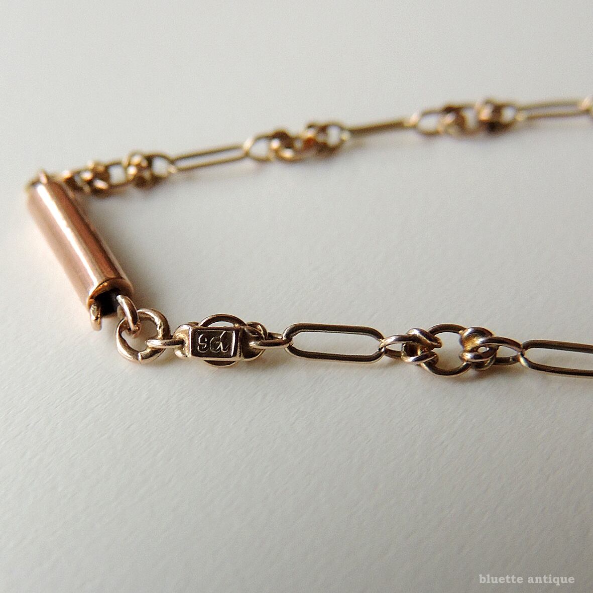オーバルとラウンドのリンクをノット(結び目)で繋ぐ、つくりのよいチェーン。一つひとつ手間をかけ、美しく結ばれたチェーンには、当時の職人さんの技術の素晴らしさを感じます。