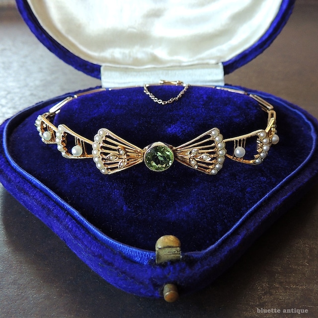 イギリスより、アンティーク、9金、シルバーコア、アカンサスのバングルです。丁度半分の面に植物(アカンサス)の模様が大らかに彫金されています。セーフティーチェーンが付属します。