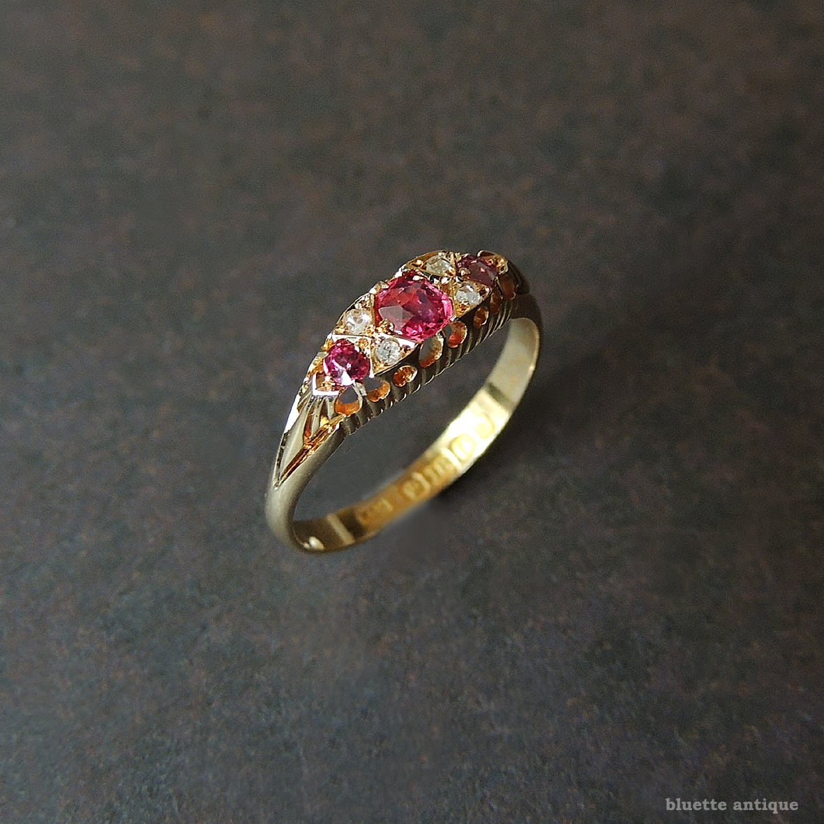 イギリスより、アンティーク、18金、天然ルビーと天然ダイヤモンドのリングです。