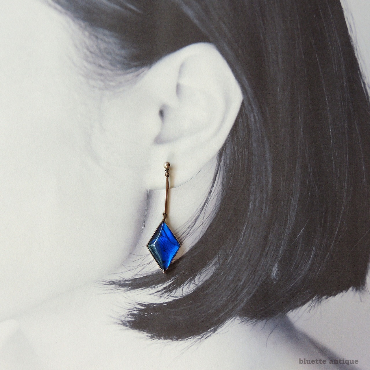 イギリスより、アンティーク、スターリングシルバー、ダイヤ型、ブルーのモルフォ蝶のイヤリングです。