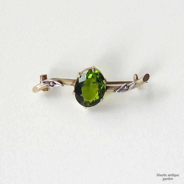 イギリスより、アンティーク、小さなグリーンガラスのブローチです。ベースはメタルで、刻印等は有りません。