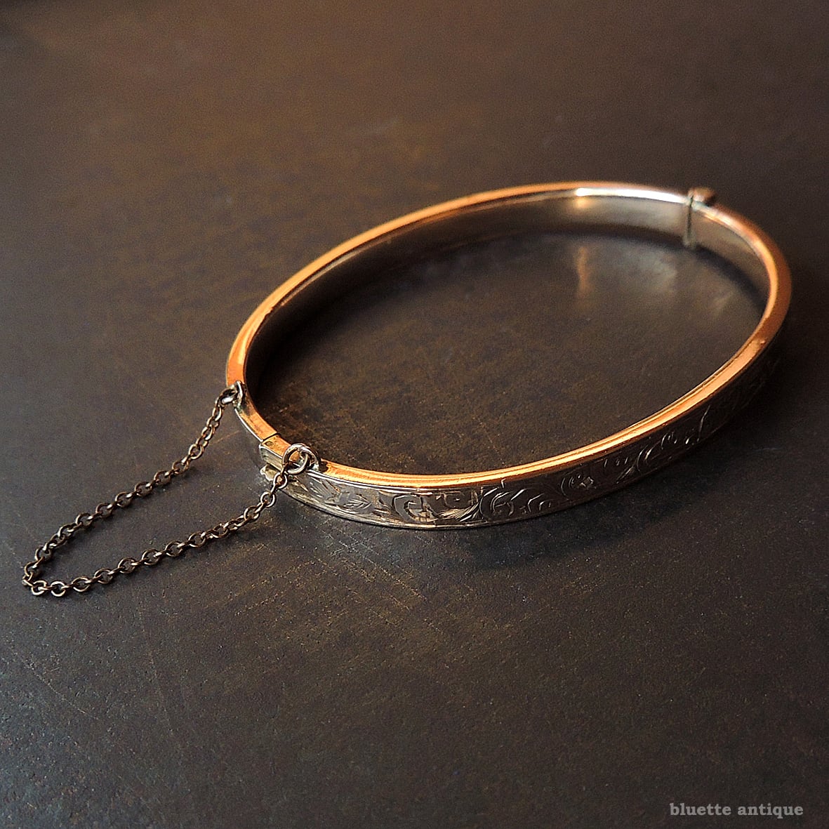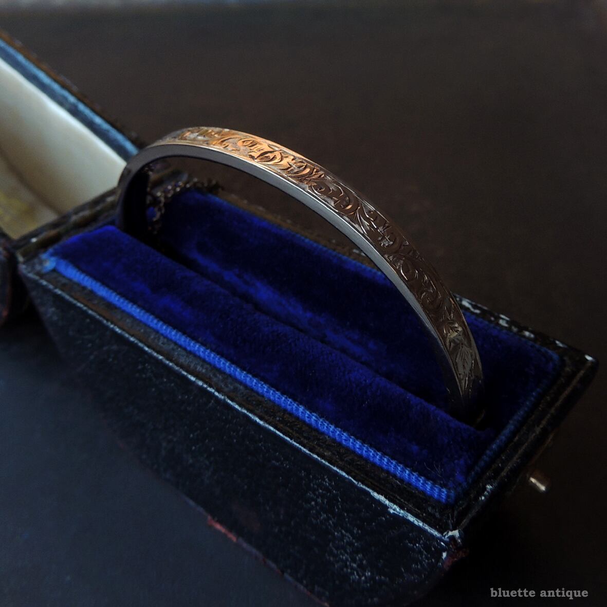 幅約5.1ミリ、重さ約7.3グラムの、すっきりとしたバングル。伸びやかなアカンサスに、隠し文様の様に添えられたアイビー、アンティークならではのデザインが美しいです。