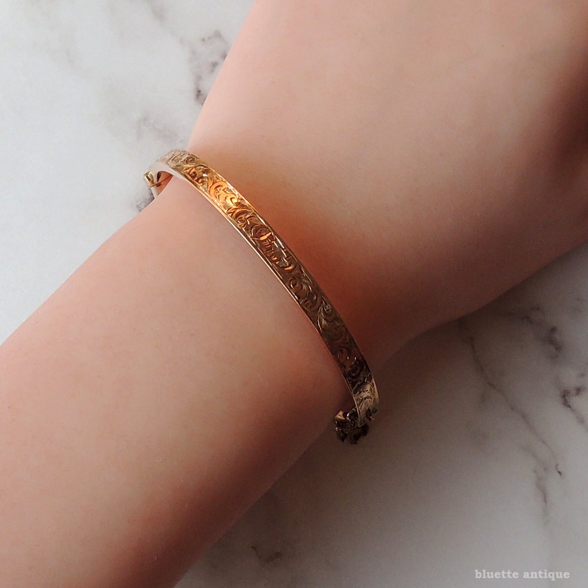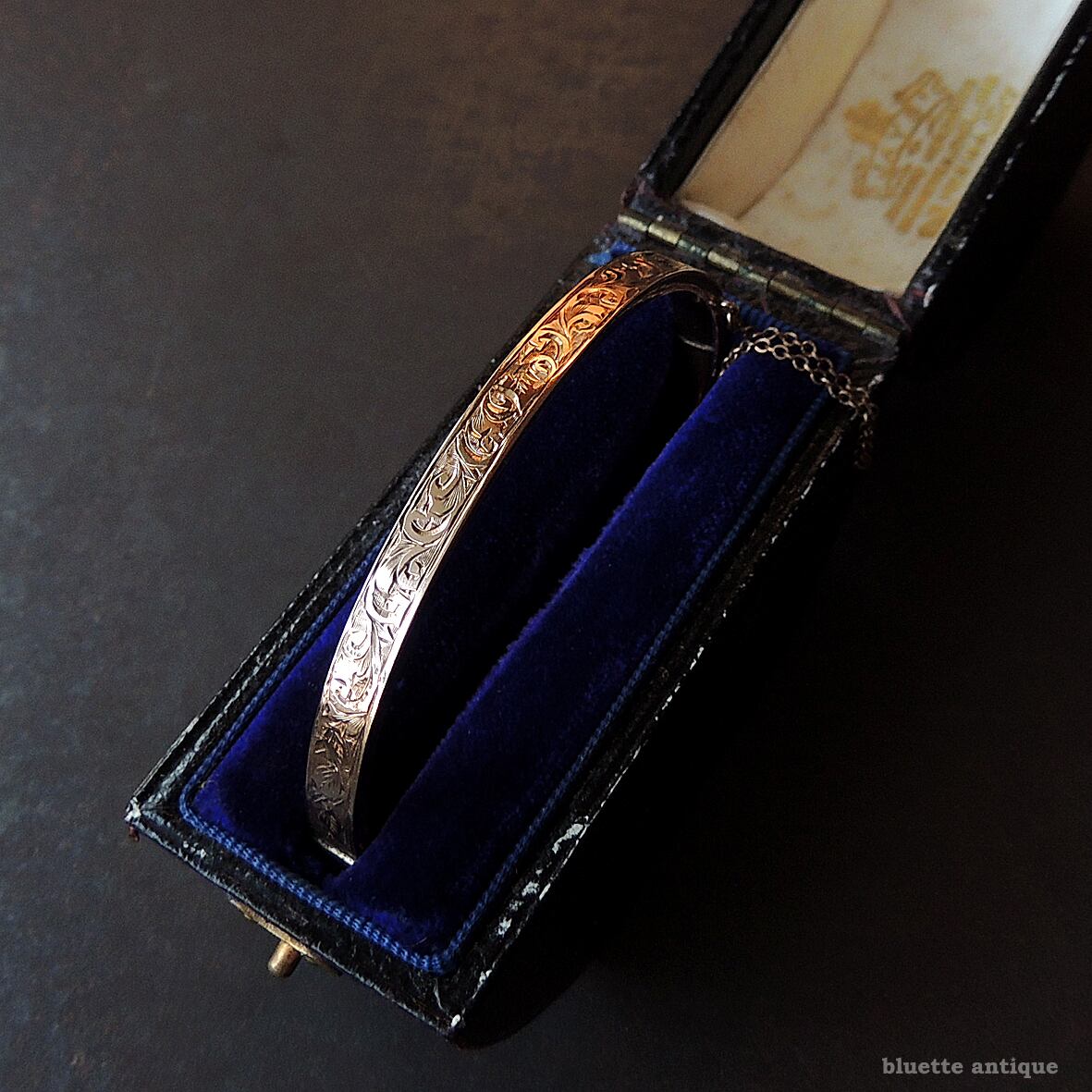 イギリスより、アンティーク、9金、アカンサスとアイビーのバングルです。半分の面にアカンサス、その両エンド部分にアイビーの模様が、繊細・鮮明に美しく彫金されています。