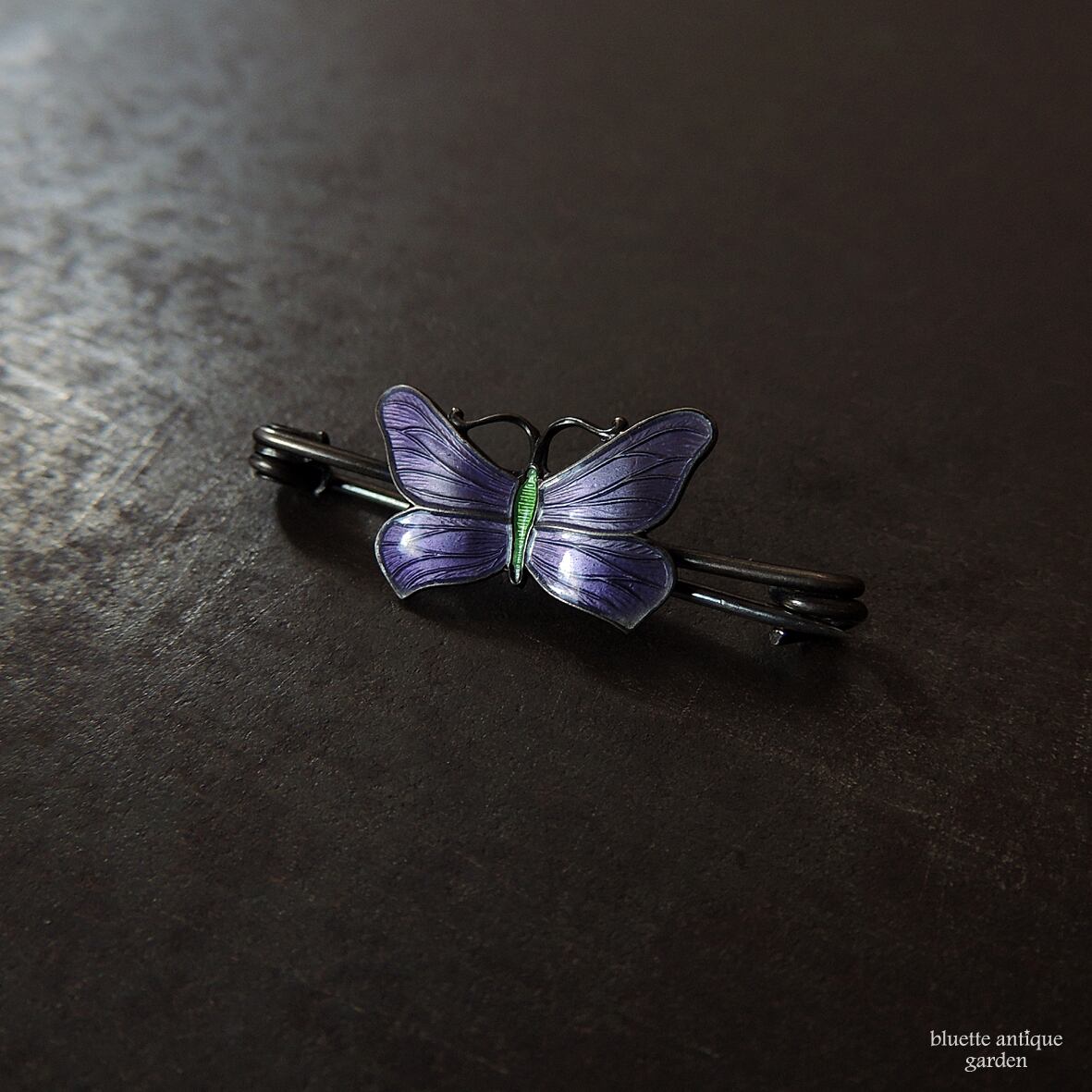 こちらは、小さな薄紫のバタフライのピンブローチ。先端でくるりと曲がった触覚、美しいギョーシェエナメル、躯体は蛍光感のある淡いグリーンと配色も綺麗です。